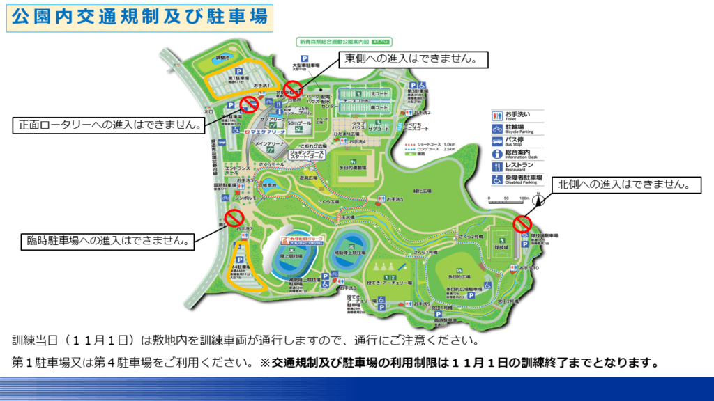 訓練の実施に伴い、公園内の道路は交通規制、駐車場は利用制限となりますのでご注意ください。また、市バスのバス乗り場は9:00~12:45まで乗降場所が変更となります。詳しくは下記をご覧ください。ご来場の皆様にはご迷惑をおかけいたしますが、ご理解のほどよろしくお願いいたします。